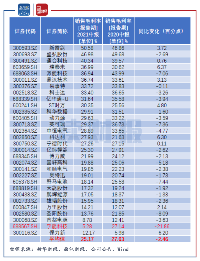 上半年公司计提固定资产折旧1.5亿元,同比增加近83%。受此影响,上半年公司毛利率同比下降21.86个百分点至5.28%。在申万三级储能设备行业30个上市公司中作对比,上半年孚能科技5.28%的毛利率在行业内排名倒数第二,同比下降幅度远大于行业平均水平。