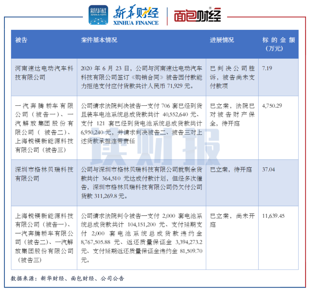 2019年至2021年前三季度,上海锐镁持续是孚能科技的前五大客户之一。截至2021年12月,孚能科技及其子公司作为原告与多名客户存在因欠款引发的诉讼,合计标的金额超1亿元。