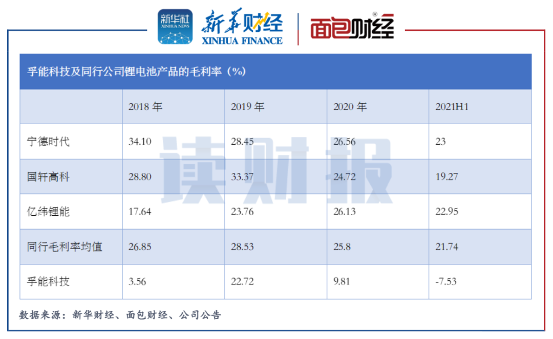 图2:2018年至2021年上半年孚能科技与同行公司锂电子产品毛利率