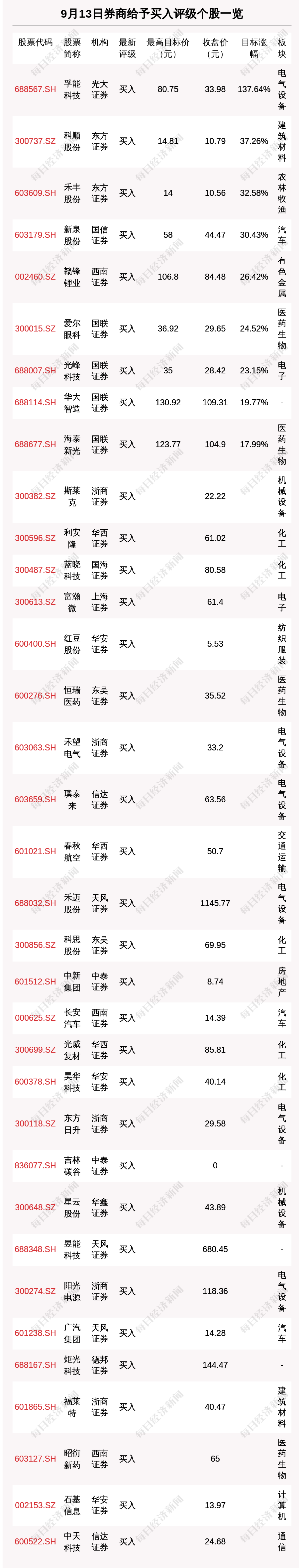 9月13日,券商给予评级的个股数共有50只,获得买入评级的个股数共有35只。在公布了目标价格的9只个股中,按照最新收盘价计算,预期涨幅排名居前的个股是孚能科技(688567.SH)、科顺股份(300737.SZ)、禾丰股份(603609.SH),预期涨幅分别是137.64%、37.26%、32.58%。