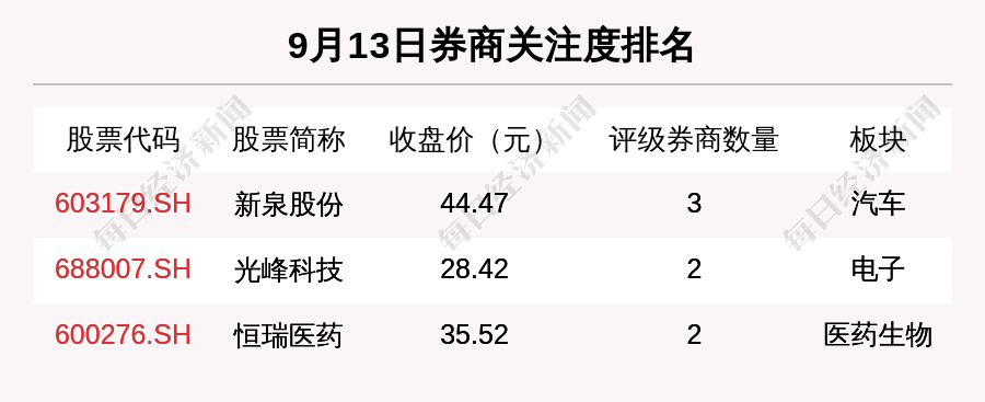 从券商对个股的关注程度来看,有3只个股获得多家券商关注,券商关注数量排名居前的个股是新泉股份(603179.SH)、光峰科技(688007.SH)、恒瑞医药(600276.SH)。