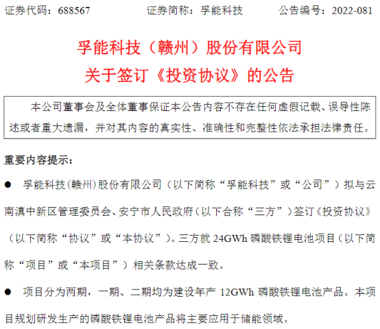 孚能科技(688567.SH)盘后公告,公司拟与云南滇中新区管理委员会、安宁市人民政府签订《投资协议》,拟在安宁工业园区麒麟片区投资建设“孚能科技24GWh磷酸铁锂电池项目”。