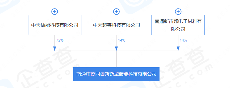 北极星储能网获悉,据企查查APP显示,12月16日,南通市协同创新新型储能科技有限公司成立,法定代表人为缪永华,注册资本500万元,经营范围包含:物联网技术研发、创业空间服务、科技中介服务、组织文化艺术交流活动等。企查查股权穿透显示,该公司由中天科技、新宙邦等间接共同持股。