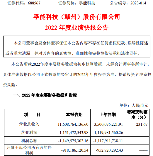 2月28日,孚能科技(688567)发布2022年度业绩快报,公告显示,2022年度营业总收入为11,608,764,136.60元,比上年同期增长231.67%;归属于母公司股东的净利润为-918,186,120.54元,较上年同期亏损减少。