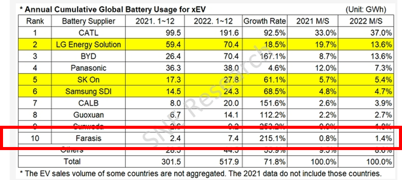 图:根据SNE Research数据,孚能科技装车量首次进入全球前十