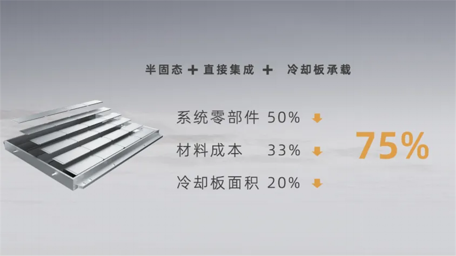 SPS电池系统的电芯直接集成于箱体,液冷板和横纵梁集成,液冷板既有良好的加热与冷却作用,又很好地起到加强电池包结构的效果,使系统零部件减少50%,材料成本降低33%,体积利用率增加30%至75%。