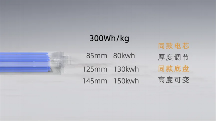 这一方案能够在同款底盘、一款电芯的基础上,通过调节卧式布置的大软包电芯高度,使得电池包高度能够在85mm到145mm之间灵活调节,搭载80kWh到150kWh的电量,满足从性能轿跑到城市皮卡的电动化需求。