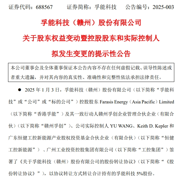 1月3日晚,孚能科技公告称,公司控股股东或将由香港孚能变更为广州工业投资控股集团有限公司(以下简称广州工控集团),实际控制人或将由董事长王瑀和Keith D. Kepler变更为广州市人民政府,并于2025年1月6日复牌。