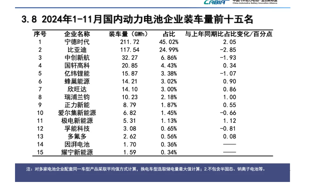 2024年1-11月,宁德时代的装车量为211.72GWh,市占率为45.02%。同时宁德时代也是国内动力电池企业装车量前十五名中涨幅最大的厂商,达到2.05%。