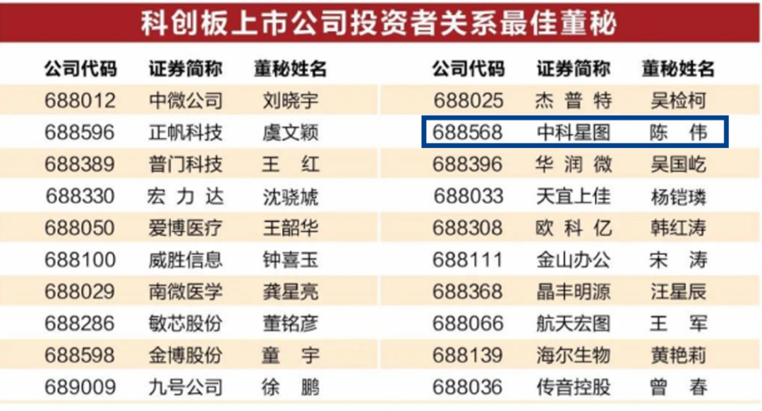 4月22日,由证券时报社主办的第十三届中国上市投资者关系天马奖评选榜单正式揭晓。中科星图股份有限公司(以下简称“中科星图”)董事、高级副总裁、董事会秘书陈伟荣获“科创板上市公司投资者关系最佳董秘奖”。