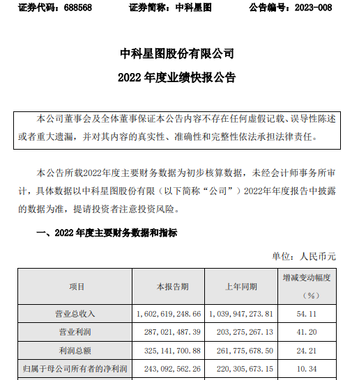 2月28日,中科星图(688568)发布2022年度业绩快报,公告显示,2022年度营业总收入为1,602,619,248.66元,比上年同期增长54.11%;归属于母公司股东的净利润为243,092,562.26元,比上年同期增长10.34%。