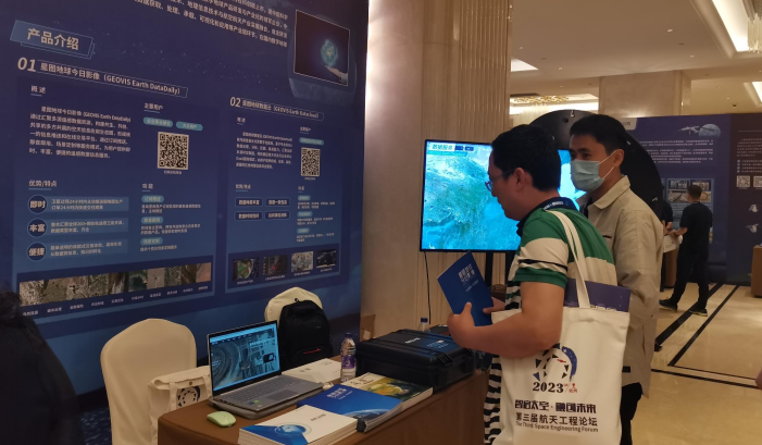在中科星图展区,参加论坛的领导、院士、专家和观展嘉宾们纷纷驻足了解体验。本次展览期间,中科星图展出了星图地球今日影像和星图地球数据云两款核心产品。