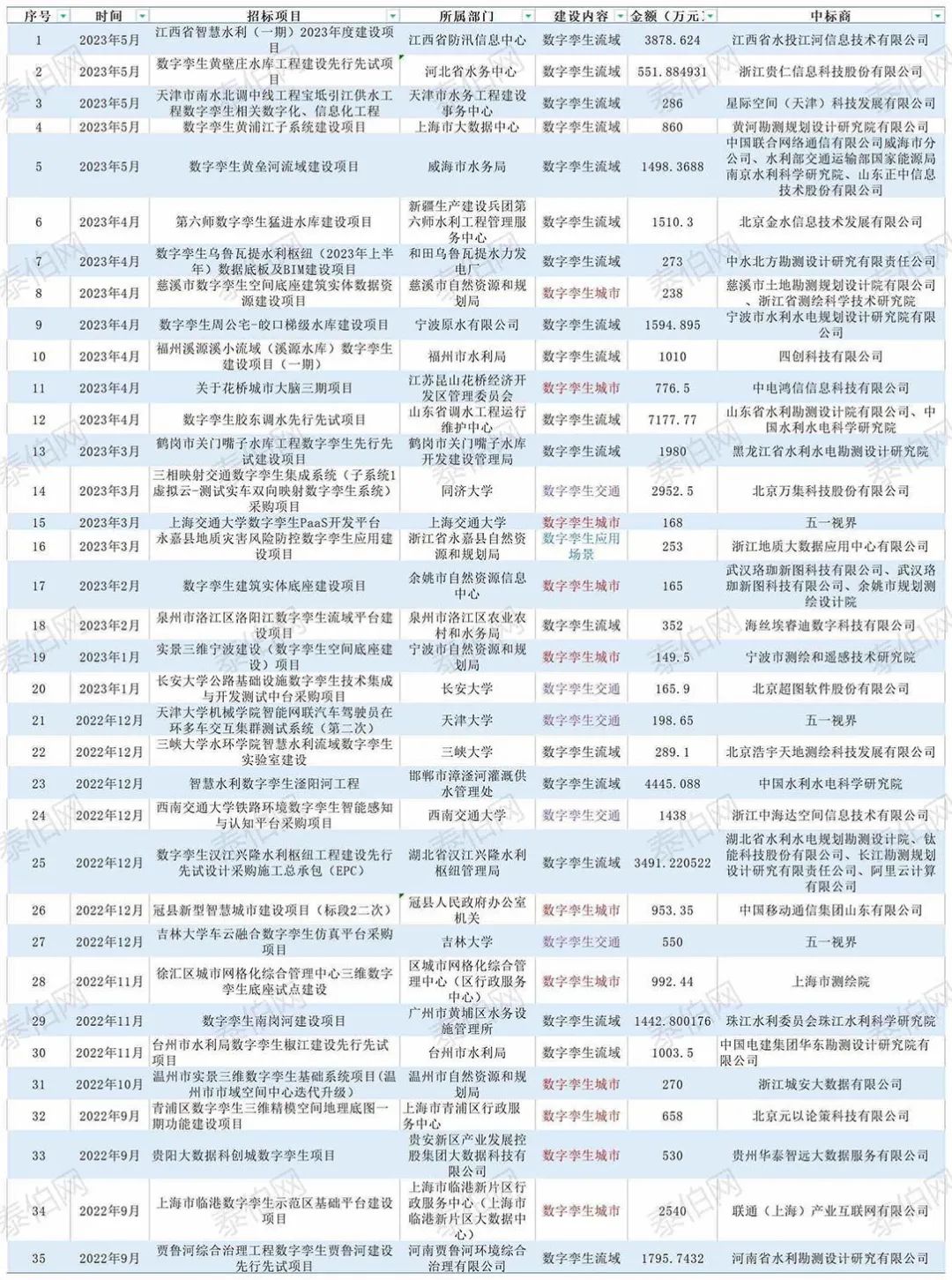 其中,过千万级的项目中,涉及2个数字孪生交通项目和1个数字孪生城市项目,其余12个均为数字孪生流域项目。