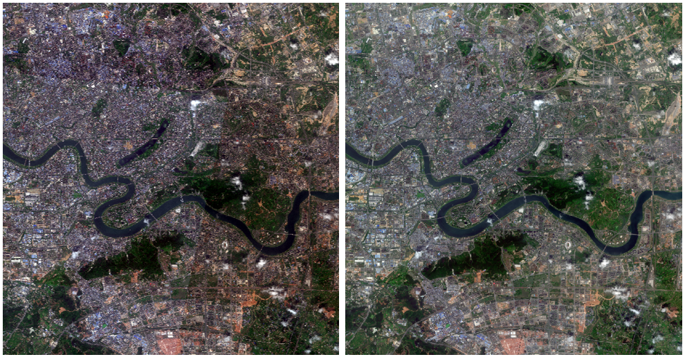 采用影像物理模型,对卫星参数进行自动校验与误差补偿,实现像素级的正射校正,解决遥感影像内部畸变及变形的问题。星图地球超算数据工场还利用Pansharp、GS等算法实现多源影像高保真融合,使影像纹理清晰、色彩自然。