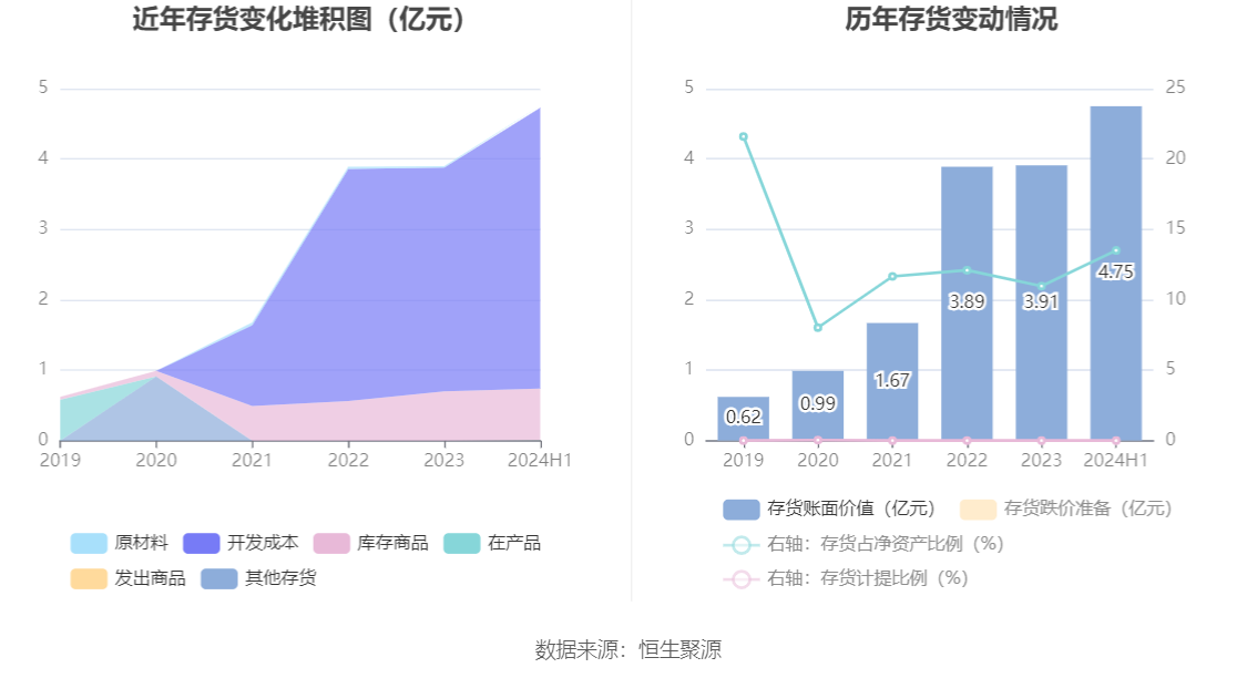 从存货变动来看,截至2024年上半年末,公司存货账面价值为4.75亿元,占净资产的13.5%。根据财报,公司本期没有计提存货跌价准备。