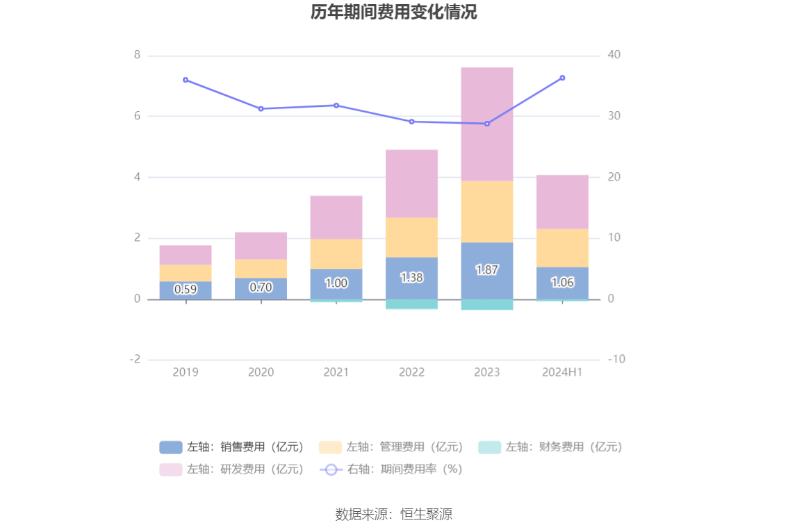 2024年上半年,公司期间费用为4.02亿元,较上年同期增加1.30亿元;但期间费用率为36.36%,较上年同期下降1.25个百分点。其中,销售费用同比增长40.48%,管理费用同比增长39.35%,研发费用同比增长36.19%,财务费用由去年同期的-2331.52万元变为-603.61万元。