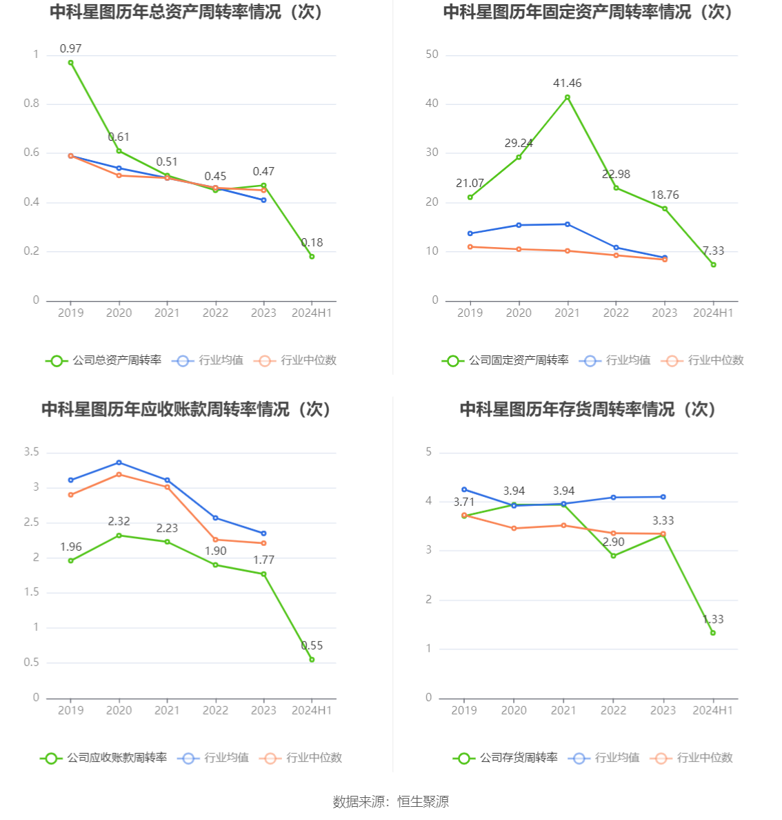 营运能力方面,2024年上半年,公司公司总资产周转率为0.18次,上年同期为0.15次(2023年上半年行业平均值为0.19次,公司位居同行业83/131);固定资产周转率为7.33次,上年同期为7.12次(2023年上半年行业平均值为4.24次,公司位居同行业37/131);公司应收账款周转率、存货周转率分别为0.55次、1.33次。