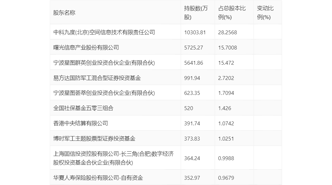 半年报显示,2024年上半年末公司十大流通股东中,新进股东为全国社保基金五零三组合、华夏人寿保险股份有限公司-自有资金,取代了一季度末的国家军民融合产业投资基金有限责任公司、北京首元新能投资管理有限公司-青岛青首产业投资基金合伙企业(有限合伙)。在具体持股比例上,中科九度(北京)空间信息技术有限责任公司、曙光信息产业股份有限公司、宁波星图群英创业投资合伙企业(有限合伙)、宁波星图荟萃创业投资合伙企业(有限合伙)、香港中央结算有限公司、博时军工主题股票型证券投资基金、上海固信投资控股有限公司-长三角(合肥)数字经济股权投资基金合伙企业(有限合伙)持股有所上升,易方达国防军工混合型证券投资基金持股有所下降。