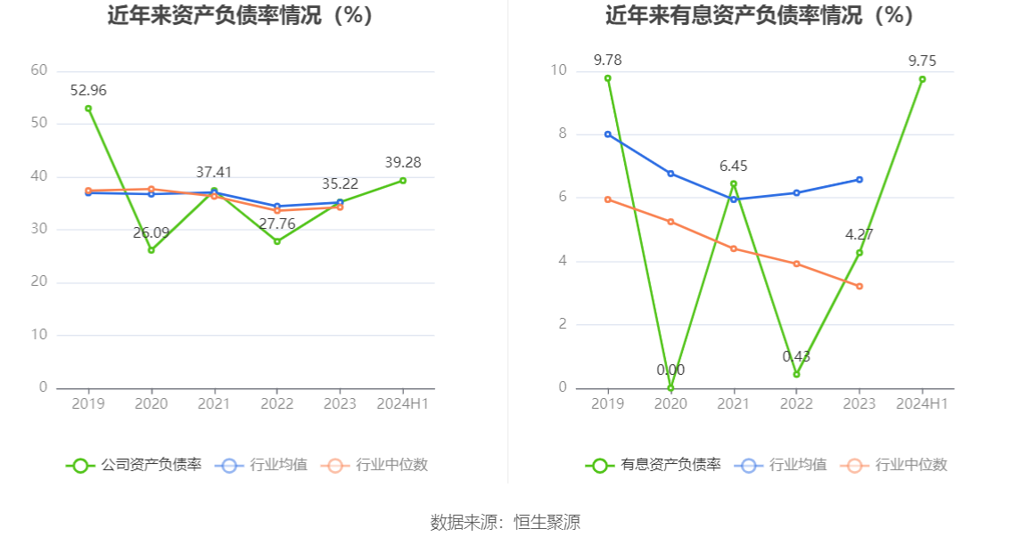 在偿债能力方面,公司2024年上半年末资产负债率为39.28%,相比上年末上升4.06个百分点;有息资产负债率为9.75%,相比上年末上升5.48个百分点。