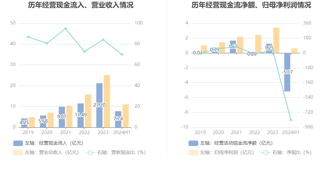 进一步统计发现,2024年上半年公司自由现金流为-5.54亿元,上年同期为-4.13亿元。