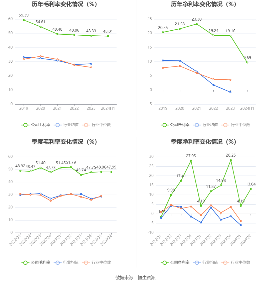 2024年上半年,公司毛利率为48.01%,同比下降3.66个百分点;净利率为9.69%,较上年同期上升0.67个百分点。从单季度指标来看,2024年第二季度公司毛利率为47.99%,同比下降3.80个百分点,环比下降0.07个百分点;净利率为13.04%,较上年同期上升1.17个百分点,较上一季度上升8.85个百分点。