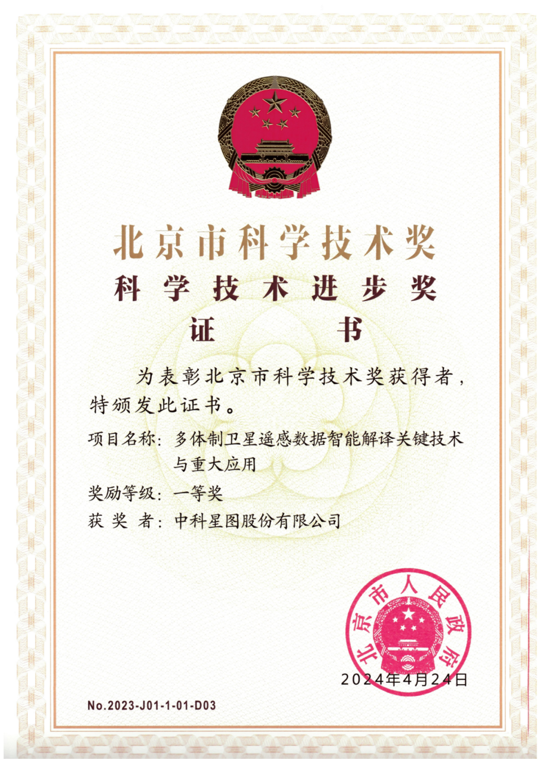 近日,北京市科技大会暨科学技术奖励大会举行,2023年度北京市科学技术奖正式公布。中国科学院空天信息创新研究院、北京科技大学、中科星图股份有限公司、中科星图维天信科技股份有限公司联合完成的“多体制卫星遥感数据智能解译关键技术与重大应用”项目荣获北京市科学技术进步奖一等奖。