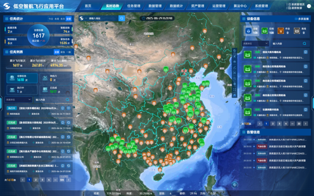 低空飞行涉及军航、民航、地方政府等多主体,“数据不通、权责不清”往往导致运行效率低下。中科星图将“协同监管”与“飞行服务”作为五位一体体系的“中枢神经”,通过领航?低空飞行服务平台,实现“纵向贯通、横向协同”,拉通全链路的低空安全运行监管。