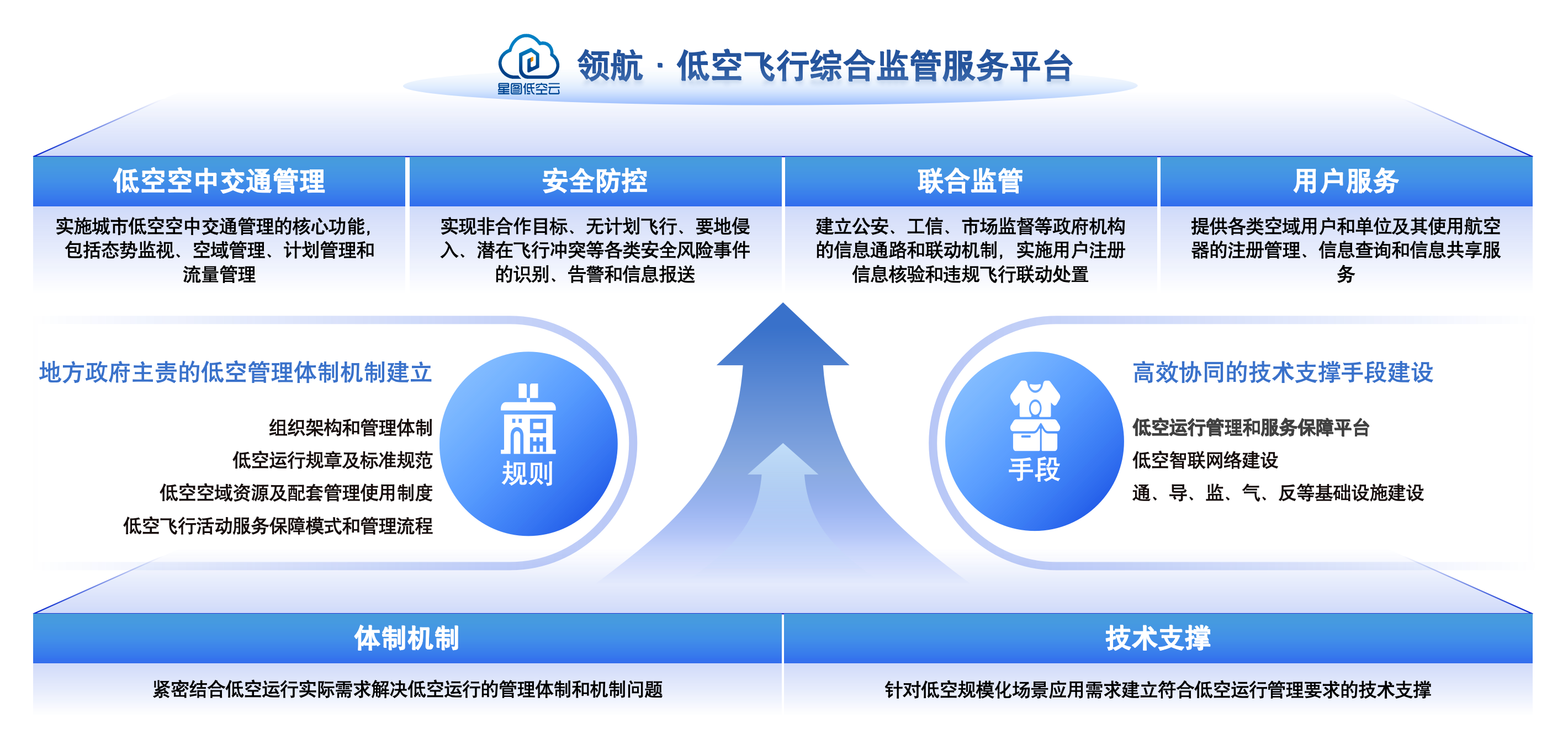 领航·低空飞行综合监管服务平台构建低空空中交通管理、联合监管、安全防控、用户服务四大核心能力,实现综合态势监视、空域资源配置、空域运行管理、飞行计划管理等核心功能项,解决多角色联动、空域协同、安全管控等低空业务痛点,形成地方政府主责的一体化运行管理范式。
