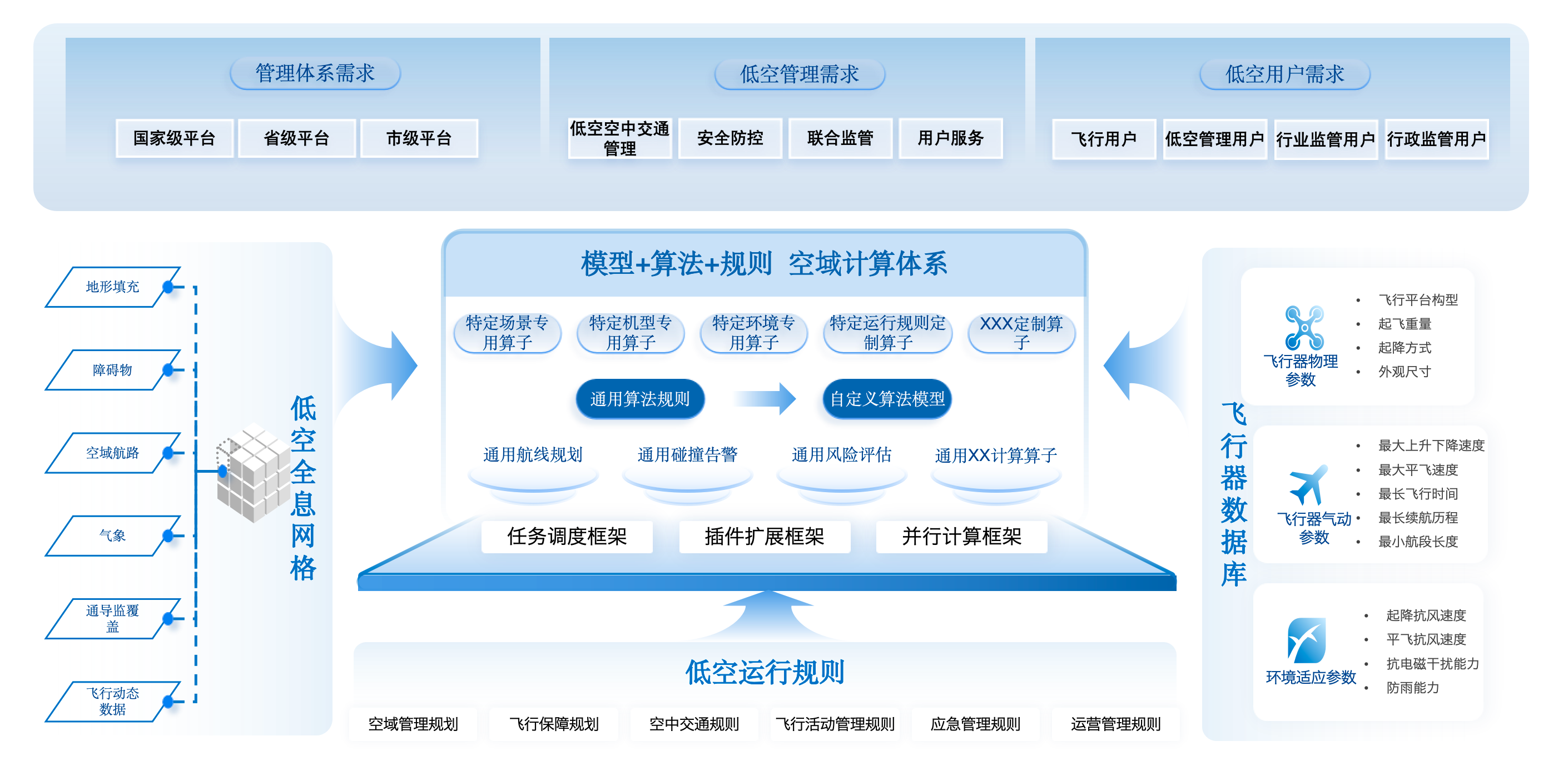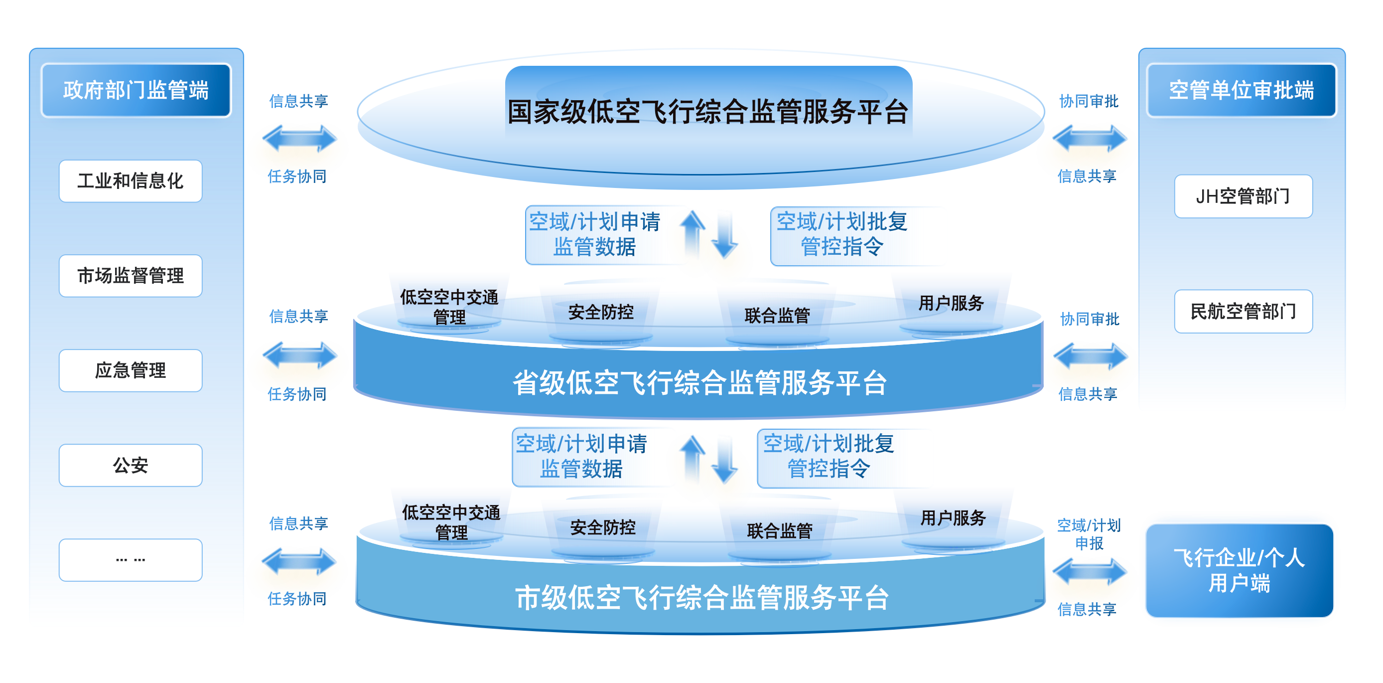 领航·低空飞行综合监管服务平台按照国家、省、市三级体系架构设计,与政府部门监管端、空管单位审批端、飞行企业/个人用户端进行信息共享,提供协同服务,符合中国国情下的低空管理需求。