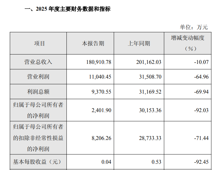 经财务部门初步测算,报告期内,公司实现营业收入180,910.78 万元,同比减少20,251.25万元,降幅10.07%;归属于上市公司股东的净利润2,401.90 万元,降幅92.03%;归属于上市公司股东的扣除非经常性损益的净利润为8,206.26万元,降幅 71.44%。