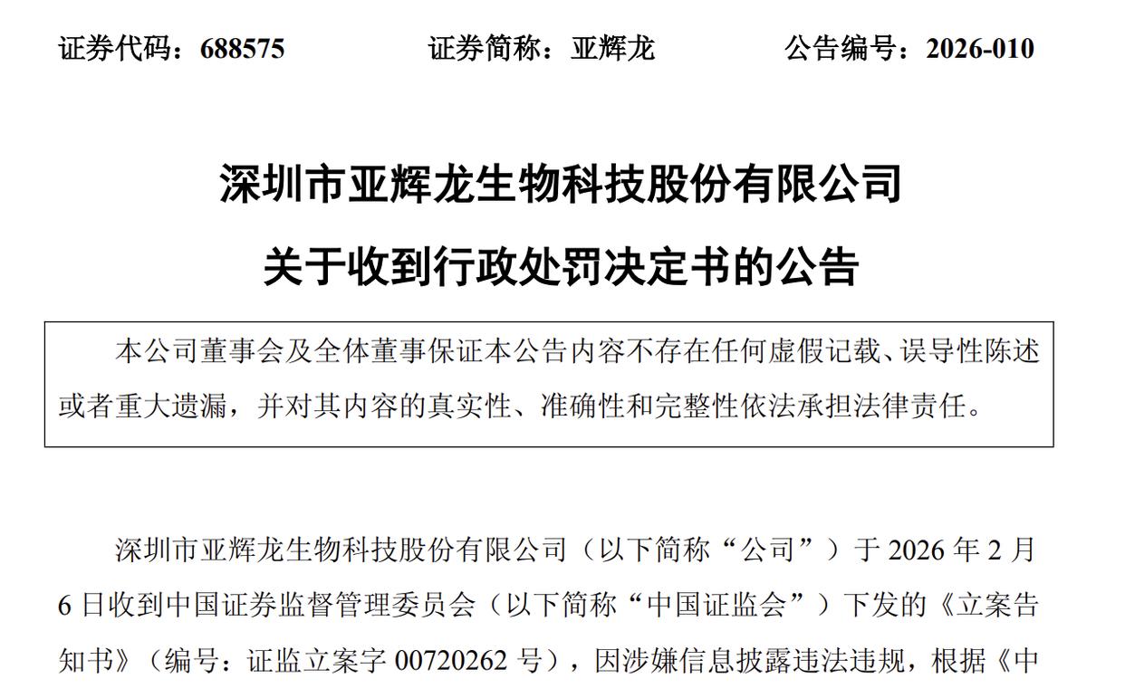 继2月28日收到证监会深圳监管局出具的《行政处罚告知书》后,今日晚间,亚辉龙(688575.SH)发布公告称,公司正式收到了《行政处罚决定书》,这意味监管机构对亚辉龙的处罚尘埃落定。
