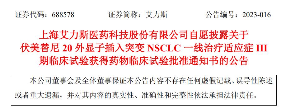 4月4日,艾力斯发布公告,甲磺酸伏美替尼片一线治疗20外显子插入突变非小细胞肺癌(NSCLC)的III期临床试验申请获得批准。