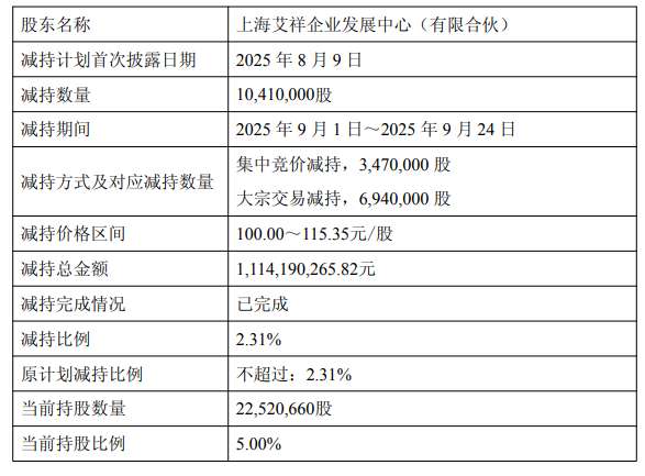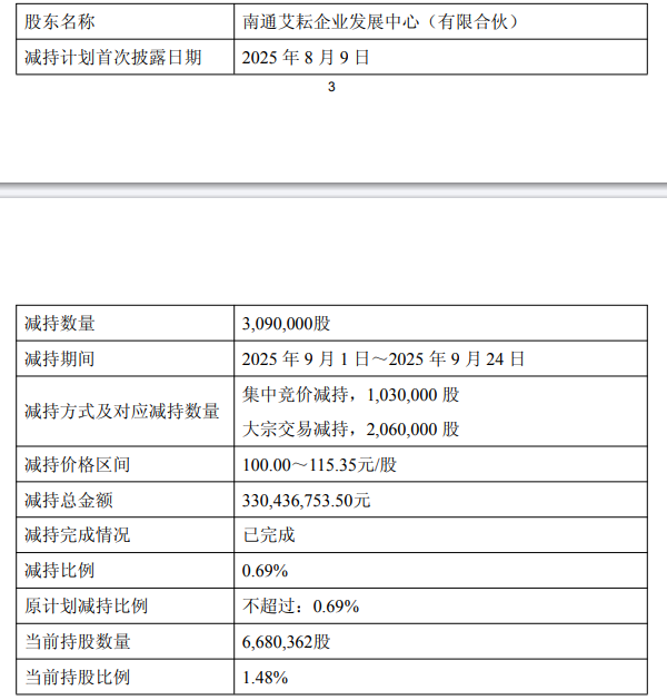 上海艾祥减持数量为1041万股,减持总金额为11.14亿元;南通艾耘减持数量为309万股,减持总金额为3.30亿元。上海艾祥、南通艾耘合计减持套现14.45亿元。