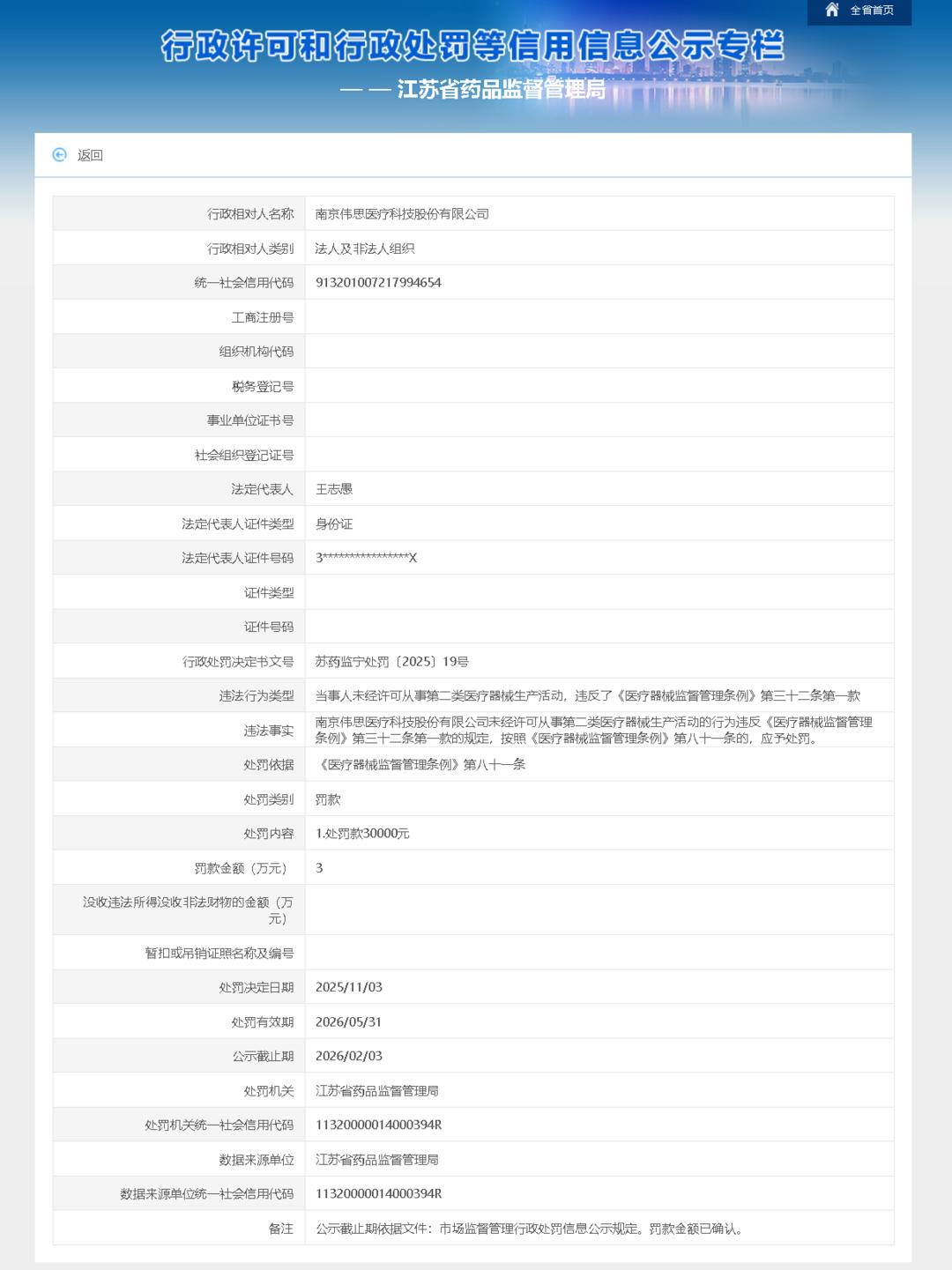 近日,齐鲁晚报·齐鲁壹点记者从江苏省药品监督管理局行政处罚公示专栏获悉,南京伟思医疗科技股份有限公司(伟思医疗 688580)因未经许可从事第二类医疗器械生产活动,违反了《医疗器械监督管理条例》第三十二条第一款,被江苏省药品监督管理局罚款3万元。