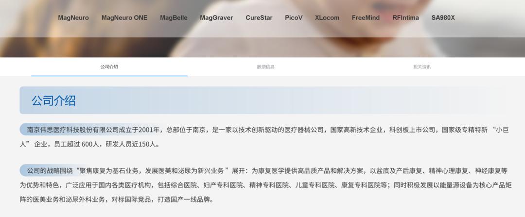 伟思医疗成立于2001年,总部位于南京,是一家以技术创新驱动的医疗器械公司,国家高新技术企业,科创板上市公司,国家级专精特新“小巨人”企业,员工超过 600人,研发人员近150人。