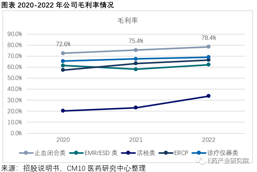 在安杰思现有的业务板块中,止血闭合类产品占比最高,2020-2022年占比分别为51.30%、56.46%以及54.94%,是公司主要的现金流业务。该产品线的毛利率在公司产品组合中也是最高的,分别为72.6%、75.4%以及78.4%,保持连续增长趋势。其原因除了有产品本身结构优化外,还有扩大生产所带来的规模效应以及更高效的供应链管理。在该业务下,公司产品包括了止血夹和双极高频止血钳。