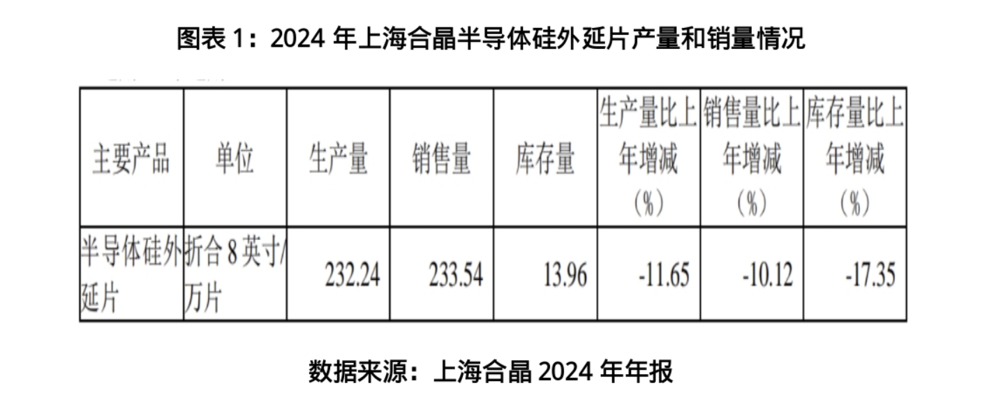年报显示,截至2024年年末,上海合晶的半导体硅外延片(折合8英寸)年产能约为440万片。2024年,其半导体硅外延片产品产量为232.24万片,同比下滑11.65%;销量为233.54万片,同比下滑10.12%。