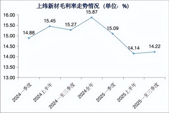 在如此逼仄环境下,成本上涨就直接导致了毛利率承压下行。数据显示,截至今年9月末,上纬新材综合毛利率为14.22%,不仅较2024年同期的15.27%减少了1.05个pct,而且也较今年年初的15.87%下降了1.65个pct。