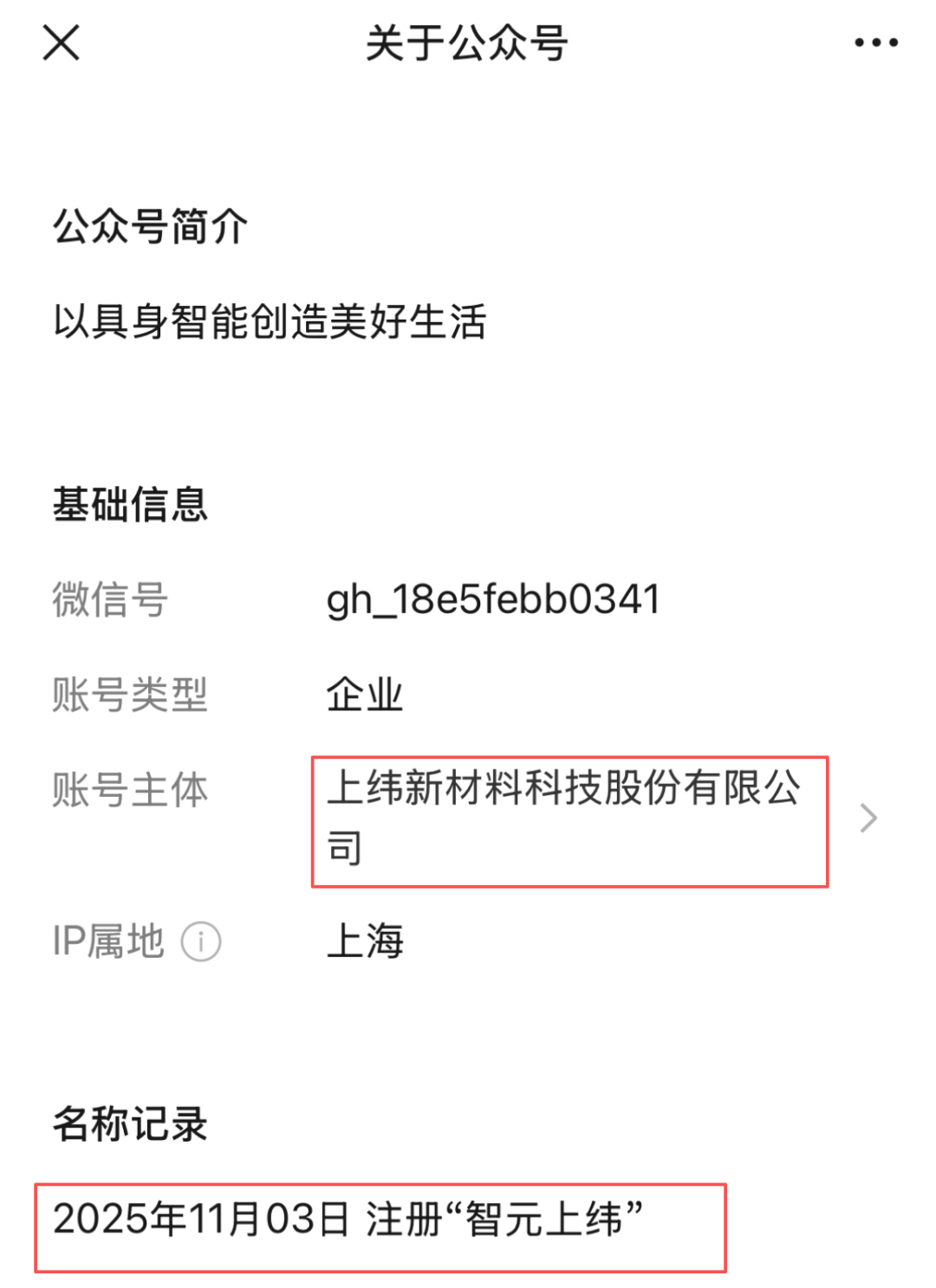 11月11日11点11分,以上纬新材料科技股份有限公司为主体注册的公众号智元上纬发布公众号推文《上纬新材来了!》,全文就两张图。