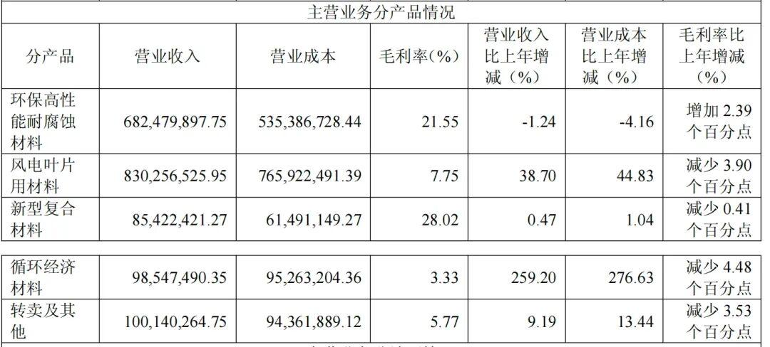再看细分产品经营数据,上纬新材四大业务板块呈现显著的分化走势。风电叶片用材料作为公司第一增长引擎,2025年营业收入同比大幅增长38.70%,增长核心动力完全来自下游风电行业装机需求复苏带动的产品销量提升,成为拉动公司整体营收增长的核心支柱。传统核心业务环保高性能耐腐蚀材料,2025年营业收入同比小幅下降1.24%,营业成本同比下降4.16%,主要受产品单位售价小幅下滑影响,同时上游原材料价格波动带动营业成本同步回落,一定程度上对冲了营收下滑的影响。新型复合材料业务则保持平稳运行,2025年实现营业收入8542.24万元,同比微增0.47%,业务规模基本与上年持平。