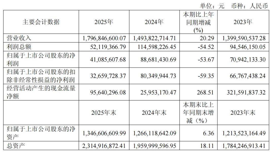 根据年报数据显示,2025年上纬新材实现营业收入17.97亿元,同比增长20.29%;实现归属于上市公司股东的净利润4089.38万元,同比下降53.67%;实现扣除非经常性损益的净利润3265.97万元,同比下降59.35%,基本每股收益0.1元。
