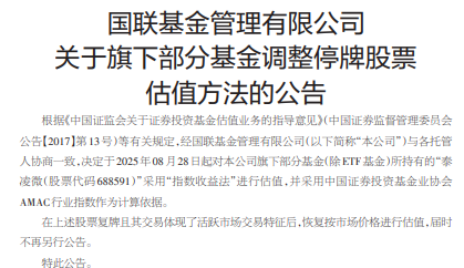 公告称,经国联基金管理有限公司与各托管人协商一致,决定于2025年8月28日起对旗下部分基金(除ETF基金)所持有的“泰凌微(股票代码 688591)”采用“指数收益法”进行估值,并采用中国证券投资基金业协会AMAC行业指数作为计算依据。