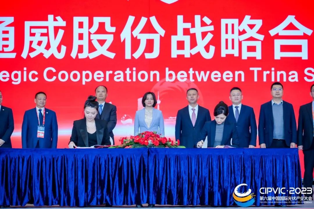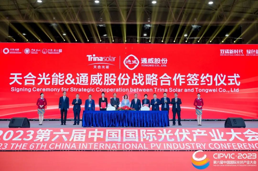 11月14日,在第六届中国国际光伏产业大会上,天合光能股份有限公司与通威股份有限公司签署战略合作框架协议,通过战略合作,在产能规划、技术协同、产品推广等方面起到生态合作的示范作用,共同促进行业高质量发展,引领全球光伏产业健康可持续发展。天合富家董事长高海纯、通威股份董事长兼CEO刘舒琪现场签约,天合光能董事长兼CEO高纪凡、通威集团董事局主席刘汉元等出席见证。