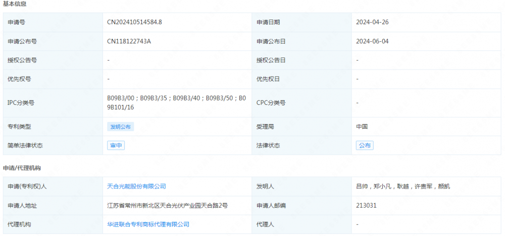 信息显示,天合光能申请一项专利,专利名称为“光伏组件回收方法及装置”,申请公布号CN118122743A,申请公布日期为2024年6月4日。