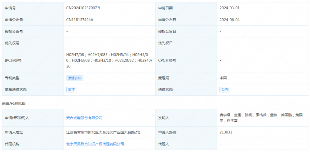 信息显示,天合光能申请一项专利,专利名称为“光伏跟踪系统及其电机控制方法、电机保护电路”,申请公布号CN118137424A,申请公布日期为2024年6月4日。