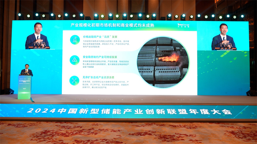 天合储能总裁孙伟发表《光储融合助力新型电力系统改革》主题演讲。他指出当前中国能源格局发生巨变,光储融合将有力支撑新能源发展。但目前行业竞争激烈,产业面临价格战阻碍产业高质发展,安全隐患制约产业可持续发展,无序扩张造成产业资源浪费。天合储能致力于构建品牌、可融资性、产品、系统集成、交付和服务在内的五维驱动力,打造高质量光储发展路径。