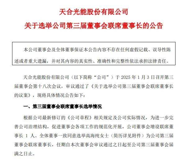 上周五,天合光能宣布选举高海纯为公司第三届董事会联席董事长,并兼任解决方案事业群总裁。这位1993年出生的女性,是天合光能创始人高纪凡之女,被外界誉为“最美光二代”。她不仅继承了父亲的商业头脑,还拥有出众的颜值,早在2017年就已进入天合系历练,担任过多个高管职位。
