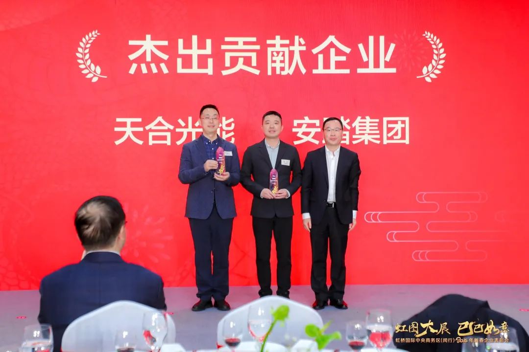 春节后第一个工作日,2月5日,上海召开2025年全市优化营商环境大会。在大会召开之际,虹桥国际中央商务区(闵行)表彰了一批光伏新能源、国际贸易、专业服务等领域的优质企业,天合光能子公司天合富家荣获虹桥“杰出贡献企业”。天合光能党委书记、副总裁蒋建峰上台领奖,天合富家副总裁王勇作为受表彰企业代表发言。