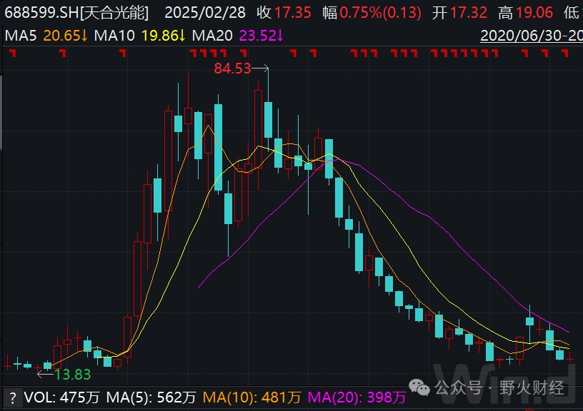 企业持续亏损,对股价肯定有影响。2022年8月,天合光能股价曾突破历史高点84元,到今年2月末,股价还剩17元左右,经历两次腰斩都不止,最新市值不到400亿元,损失大约超过1400亿元。