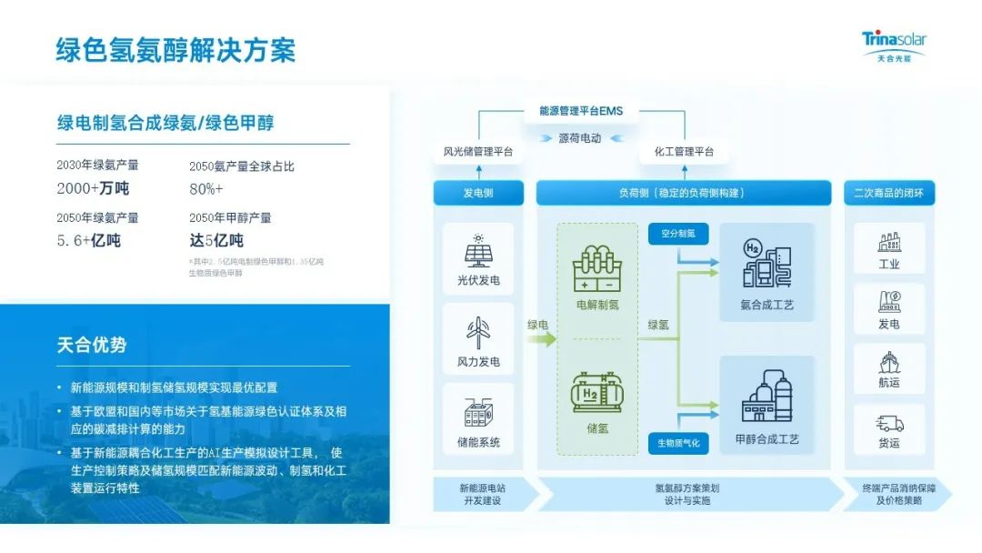 作为智慧能源解决方案领域的先行者,天合光能已率先从光伏产品制造商向光储智慧能源解决方案提供商转型。秉持“以客户为中心,以场景为导向”的理念,通过深度挖掘分布式能源、集中式电站及新场景需求,构建覆盖光储及场景融合、智能微网、虚拟电厂、零碳园区、绿色算力、绿电制氢氨醇等多元场景的解决方案矩阵。其中,绿电制氢耦合绿碳合成甲醇的应用场景,正成为破解能源化工领域脱碳难题的关键突破口。
